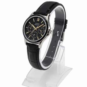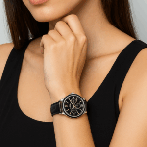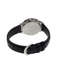 The polished silver stainless-steel case pairs beautifully with the black textured leather strap, offering comfort and durability. With precise quartz movement and chronograph-style detailing, this watch combines elegance and performance.