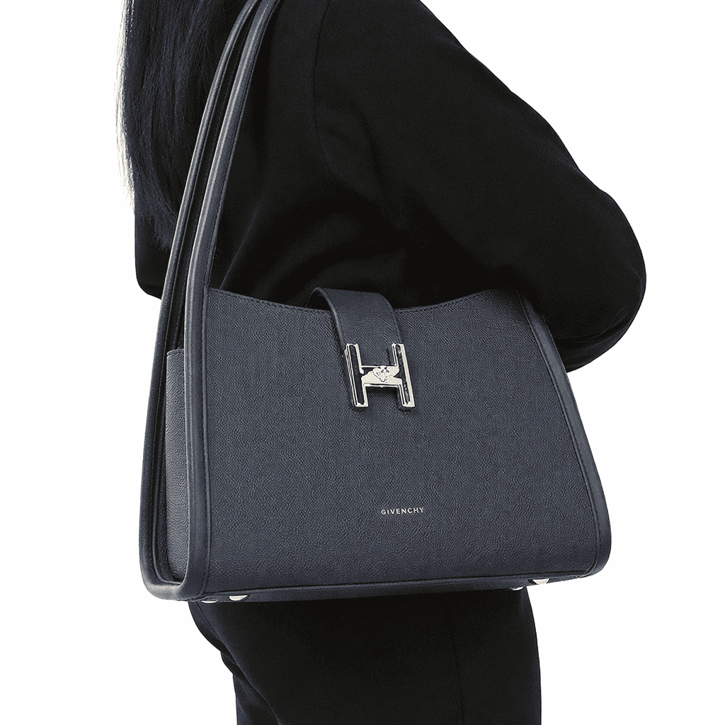 Hardware: Gold-tone hardware with a bold H-shaped clasp/lock on the front