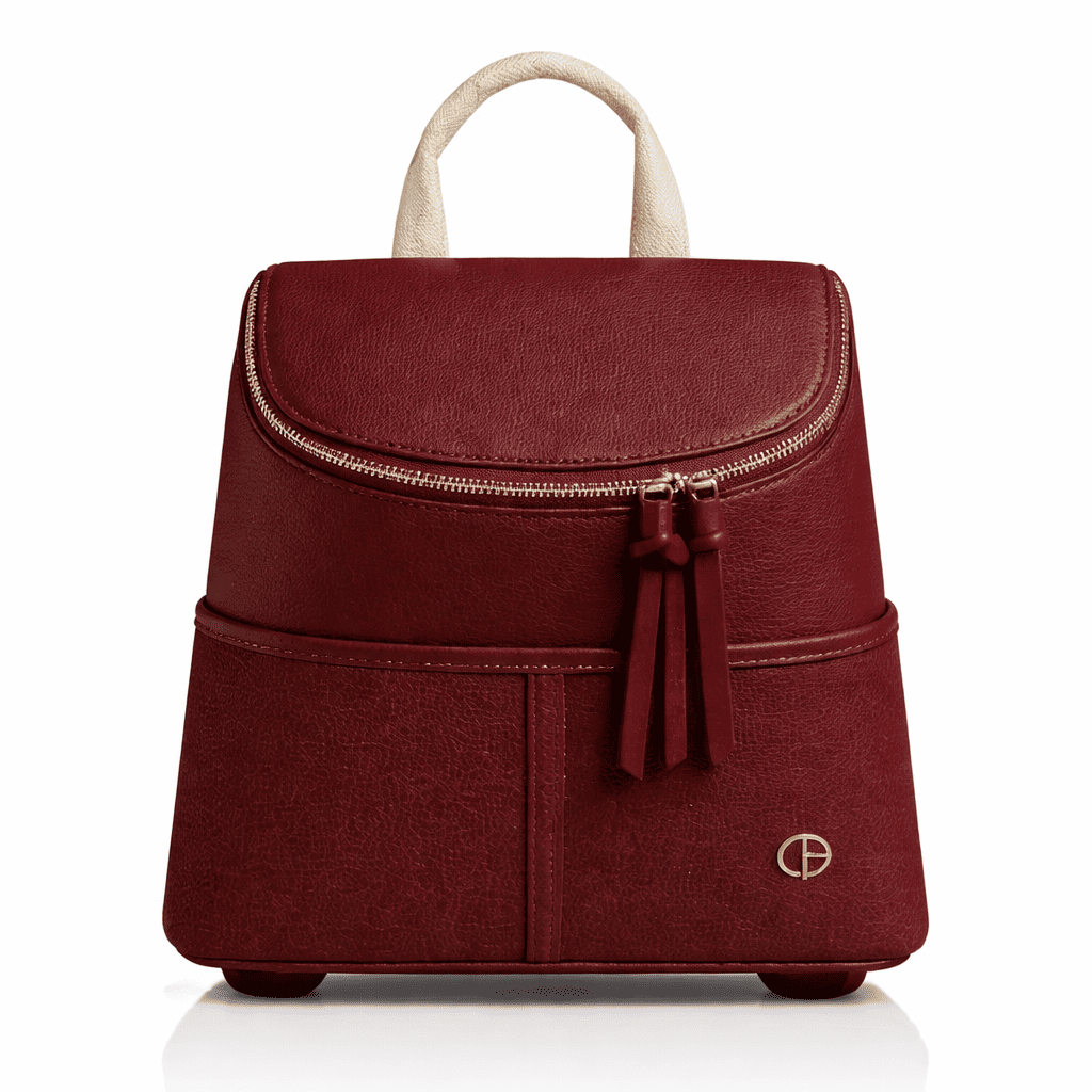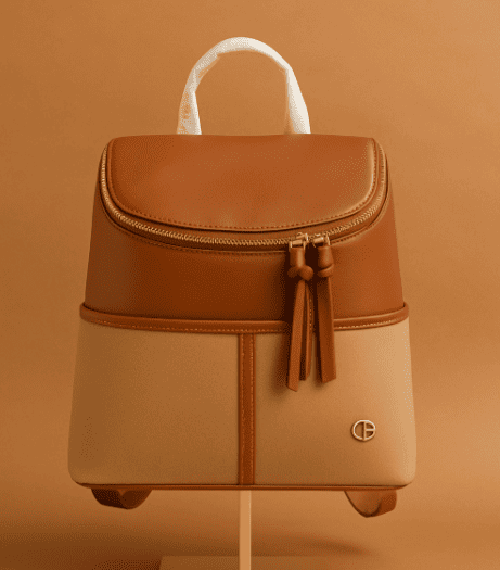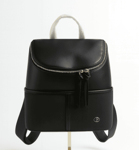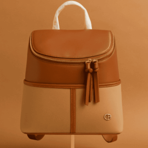 Closure: Top zipper closure with dual tassel pulls (leatherette ties attached to zipper sliders)