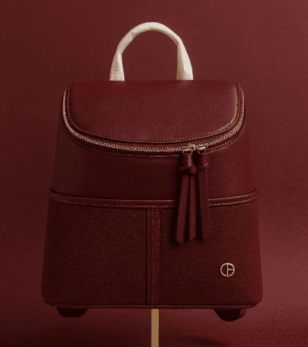 Hardware: Gold-tone zipper and logo emblem at the bottom right