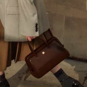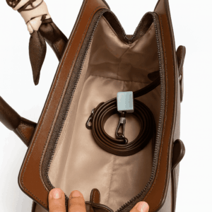 Hardware: Minimal metallic logo in gold-tone