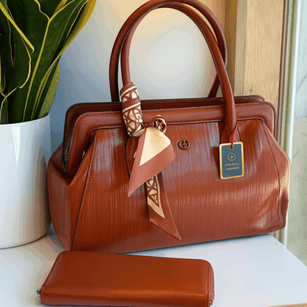 Style: Structured top-handle satchel with scarf accent