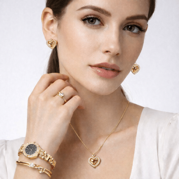 Make a statement of elegance with this luxury gold-tone heart jewelry set, crafted to deliver timeless beauty and sophistication. This premium set features a crystal-accented wristwatch paired with a matching bangle, heart pendant necklace, earrings, and ring — all harmonized with a romantic heart design.