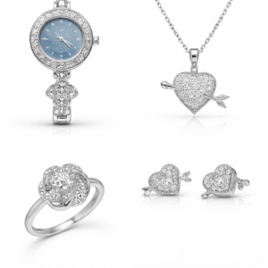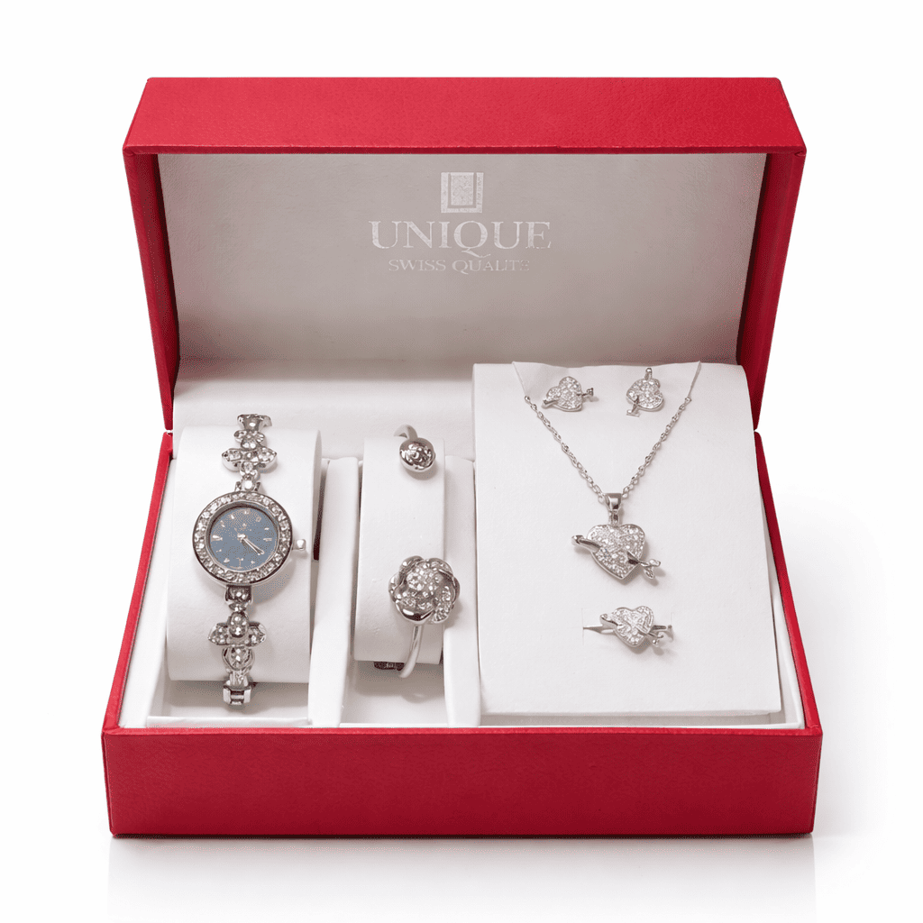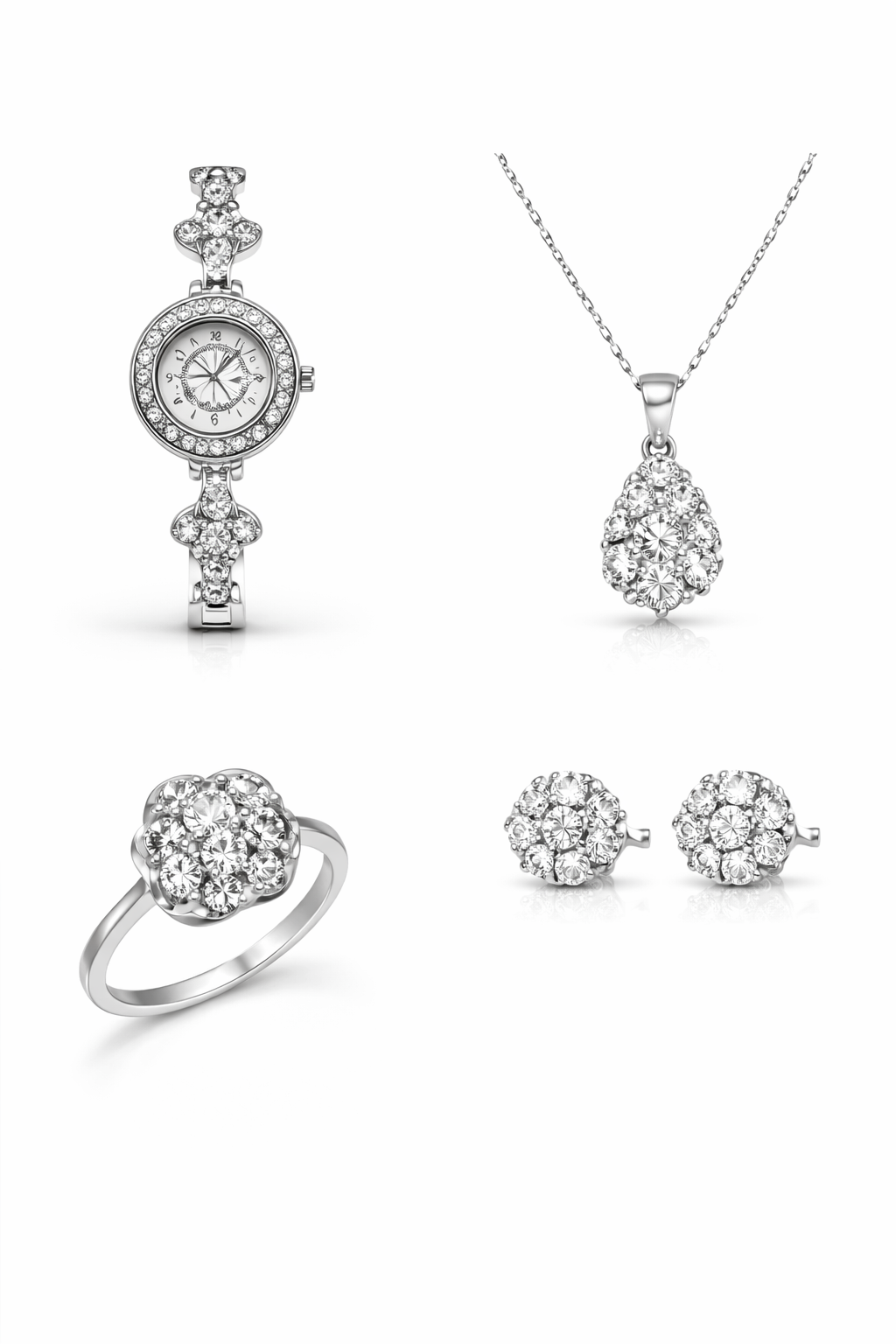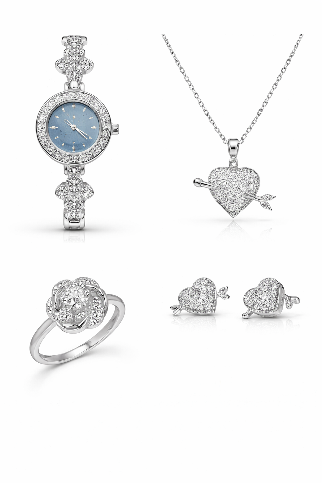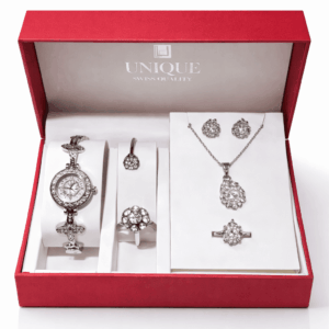Complete Luxury Gift Set – Includes an elegant crystal-decorated wristwatch, matching necklace with pendant, stylish ring, and a pair of sparkling earrings, all beautifully arranged in a premium presentation box.