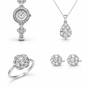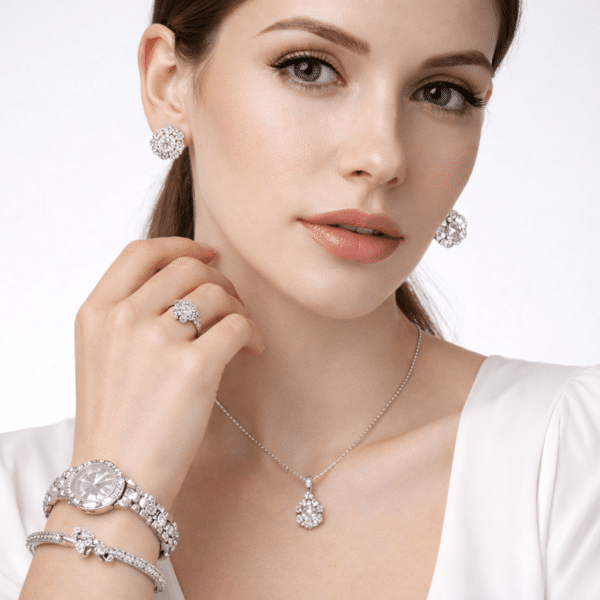 This luxury watch and jewelry set is designed for women who appreciate elegance, sparkle, and coordination. Whether worn together for a complete glamorous look or separately for everyday sophistication, this set adds effortless charm to any outfit.