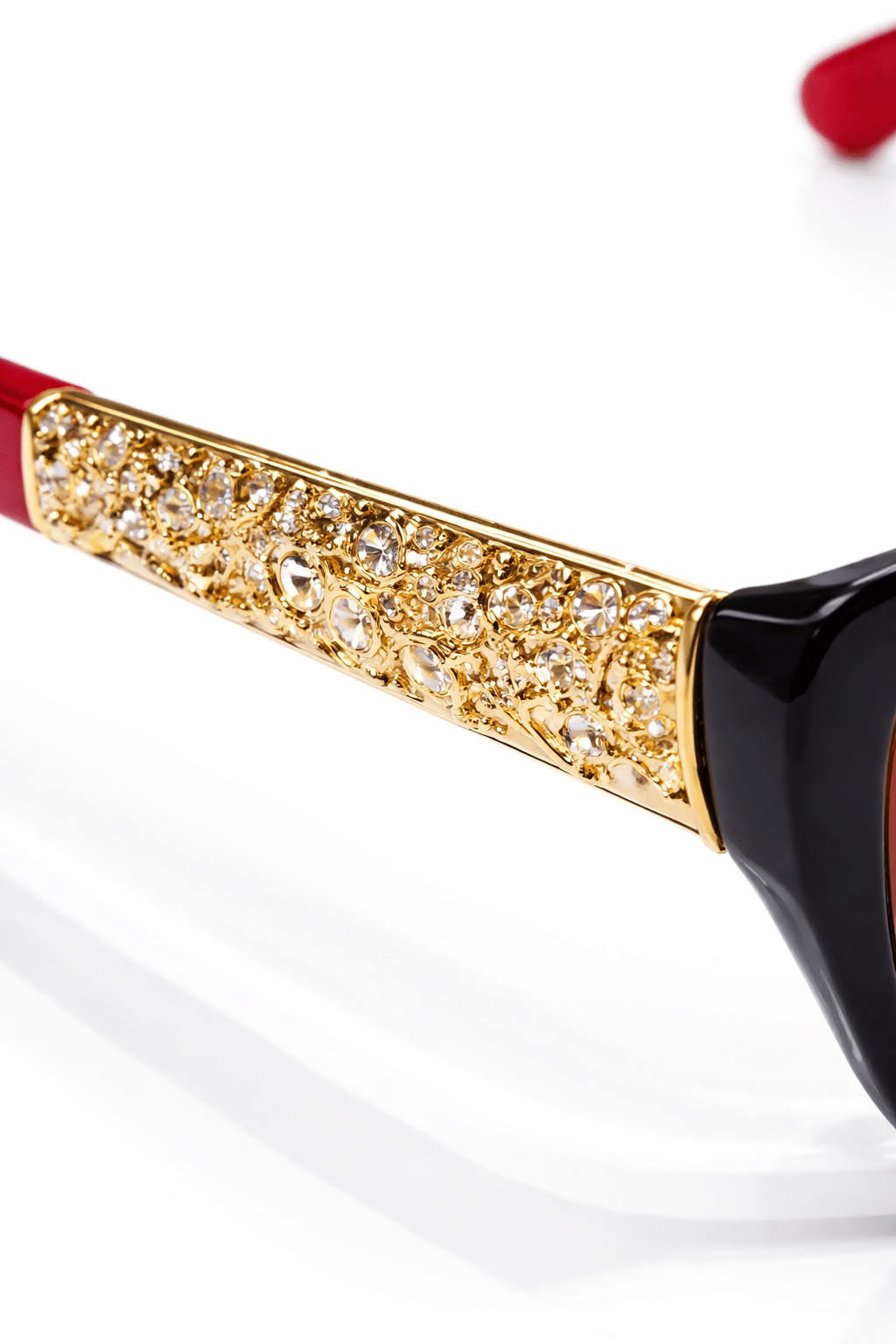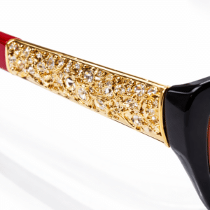 The temples feature beautiful gold-tone metal accents with crystal-style embellishments, creating a striking contrast against the black frame. Subtle branding adds an elegant signature look without overpowering the design.