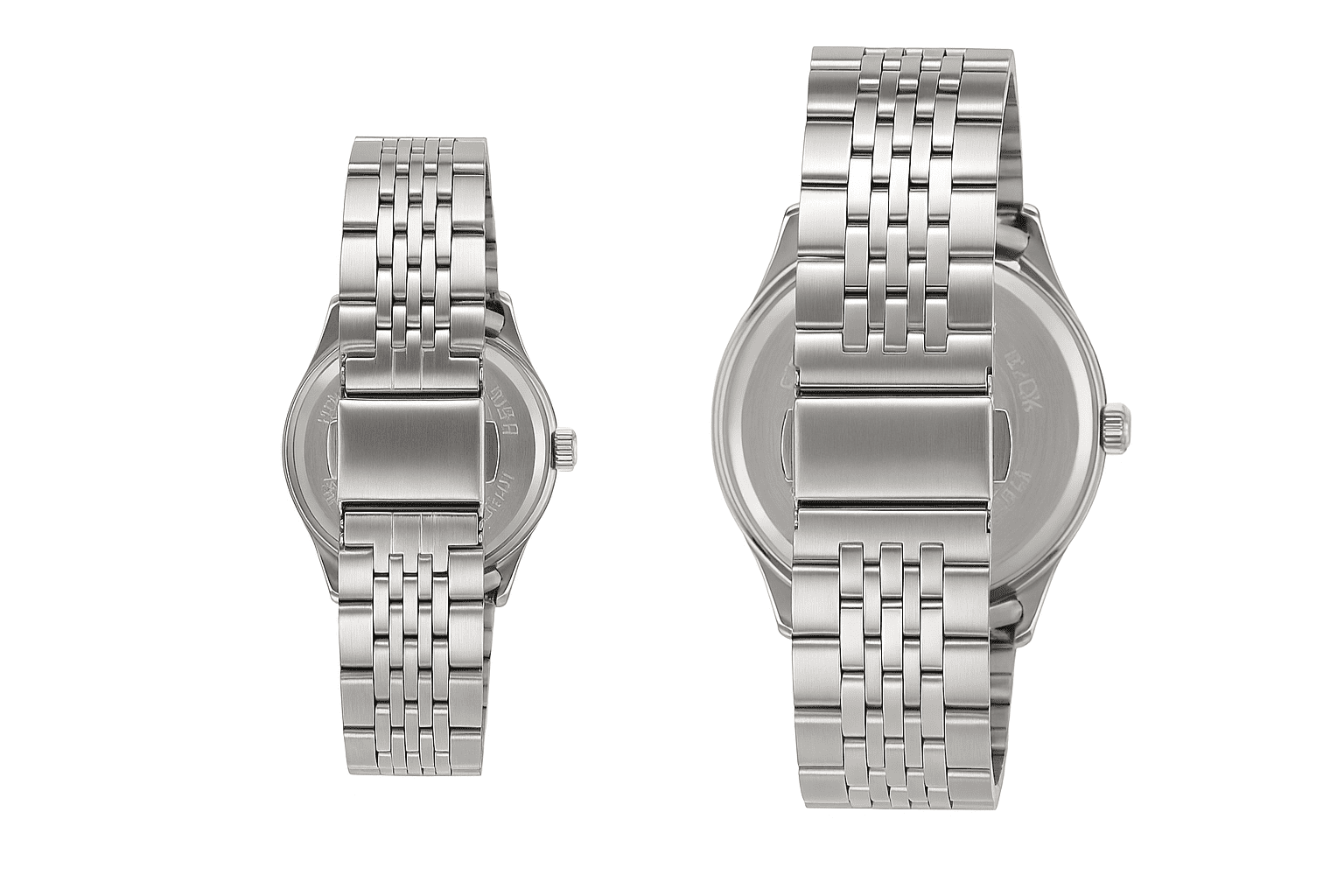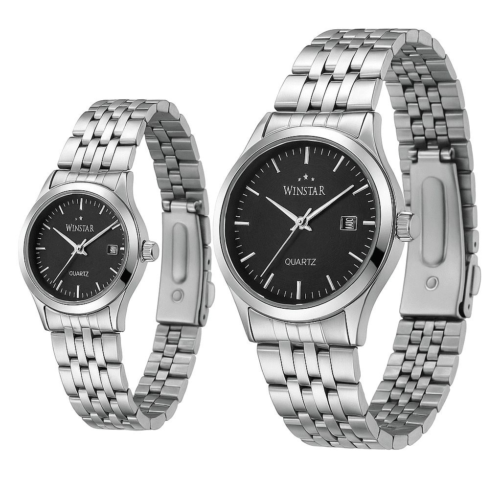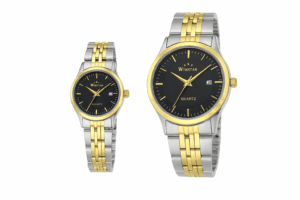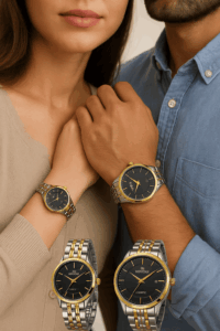 This couple watch set features two premium timepieces with a matching gold–silver stainless steel finish. The men’s model comes in a larger dial, while the women’s model is designed with a sleek, refined profile — both offering classic elegance for everyday wear or gifting.