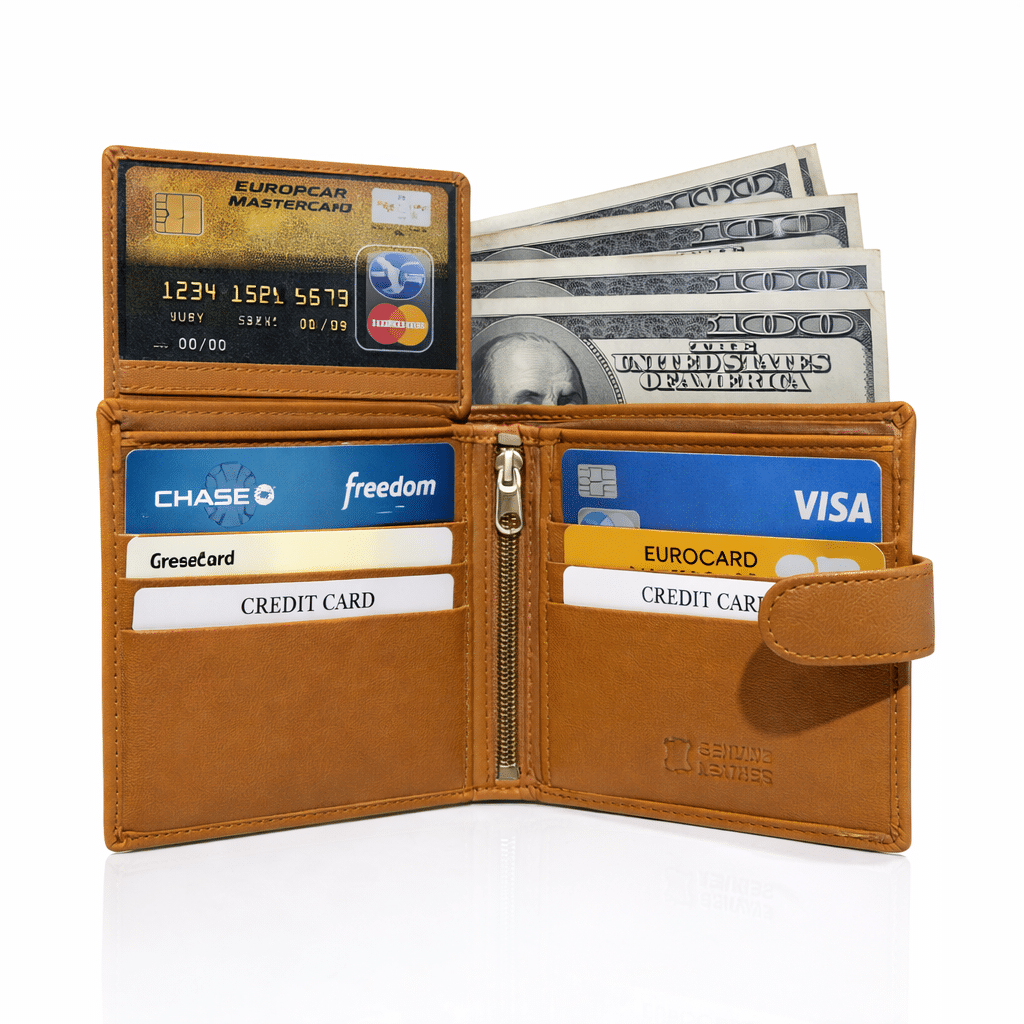 The wallet features multiple card slots that neatly organize your credit cards, debit cards, and IDs. The transparent white card slot allows quick access to identification without removing the card. A secure zippered coin pocket provides a convenient solution for storing coins, keys, or other small essentials—keeping everything in one place.
