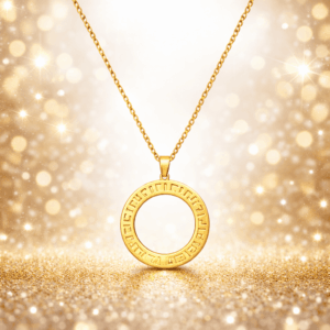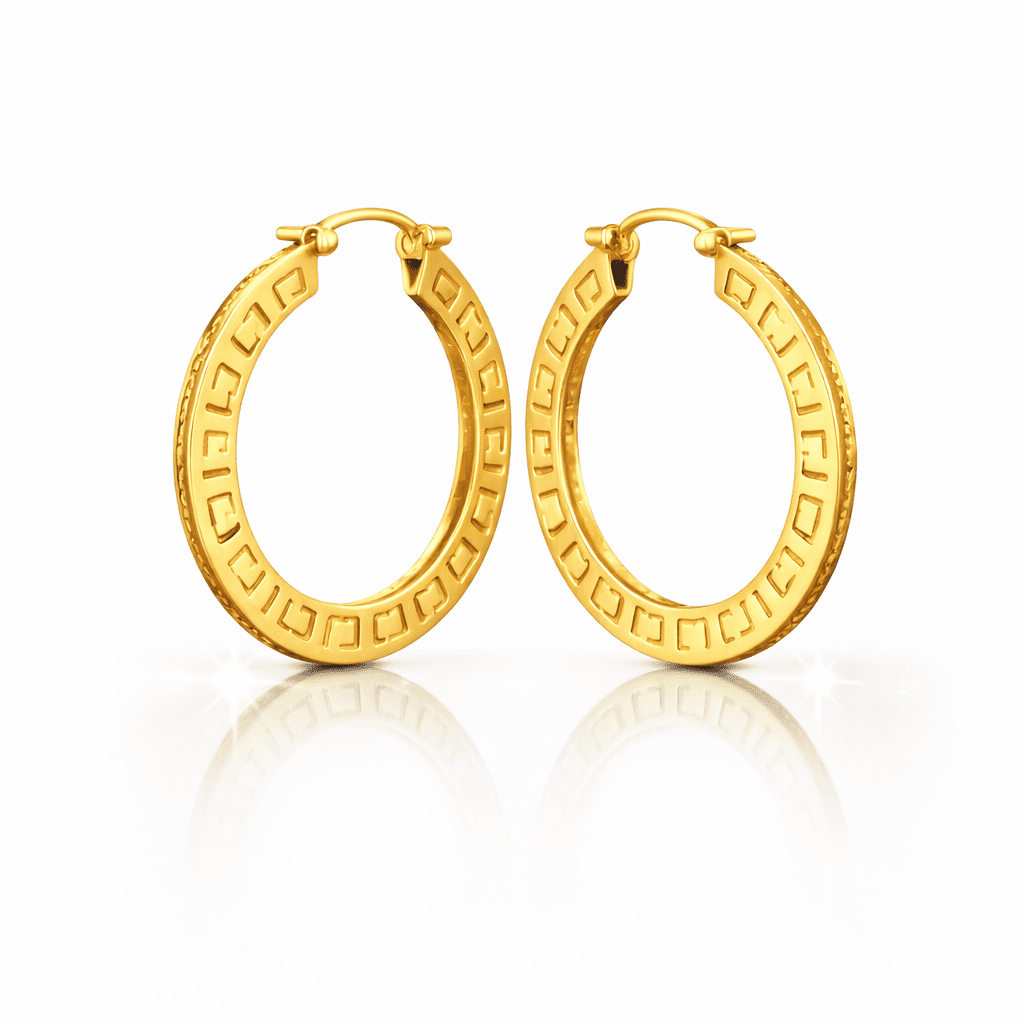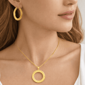 Make a bold yet elegant statement with this 10K gold plated circular pendant necklace paired with matching patterned hoop earrings. Designed for women who love modern luxury, this set features clean lines and engraved detailing for a premium, fashion-forward look.