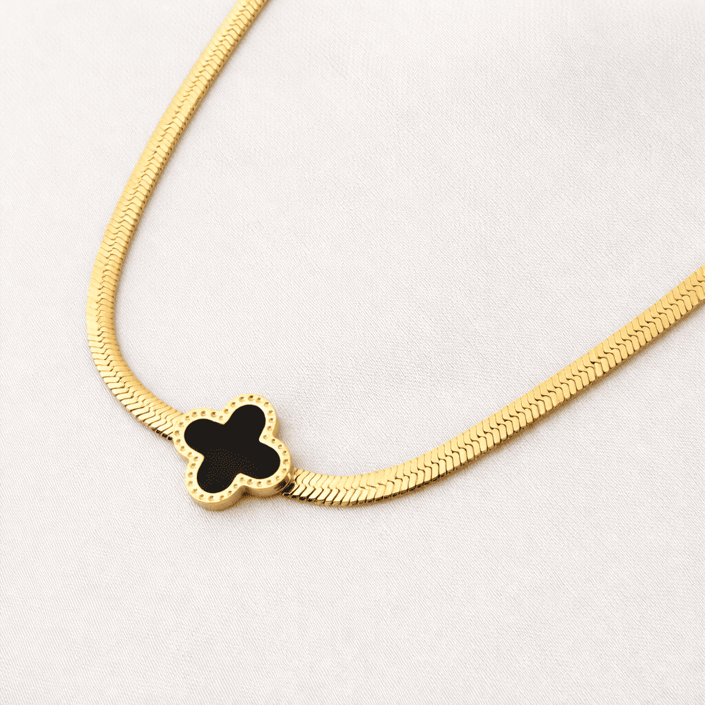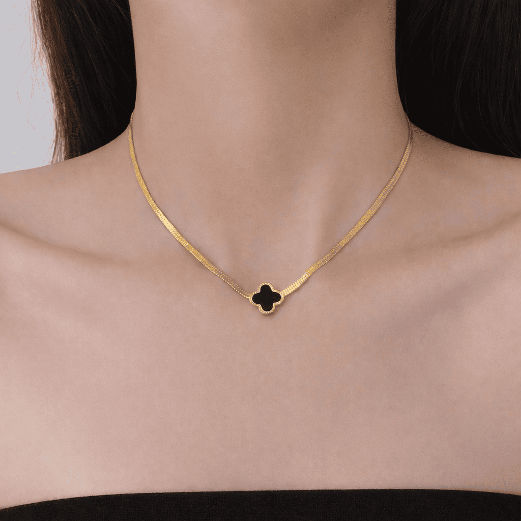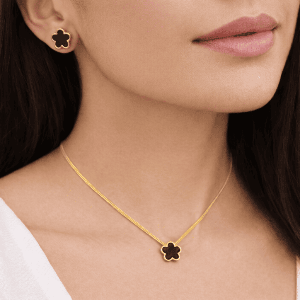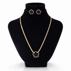 Upgrade your everyday elegance with this luxurious 10K gold plated clover necklace and stud earring set, designed with a timeless floral motif and a sleek black inlay. This refined set blends modern minimalism with classic charm, making it perfect for both daily wear and special occasions.