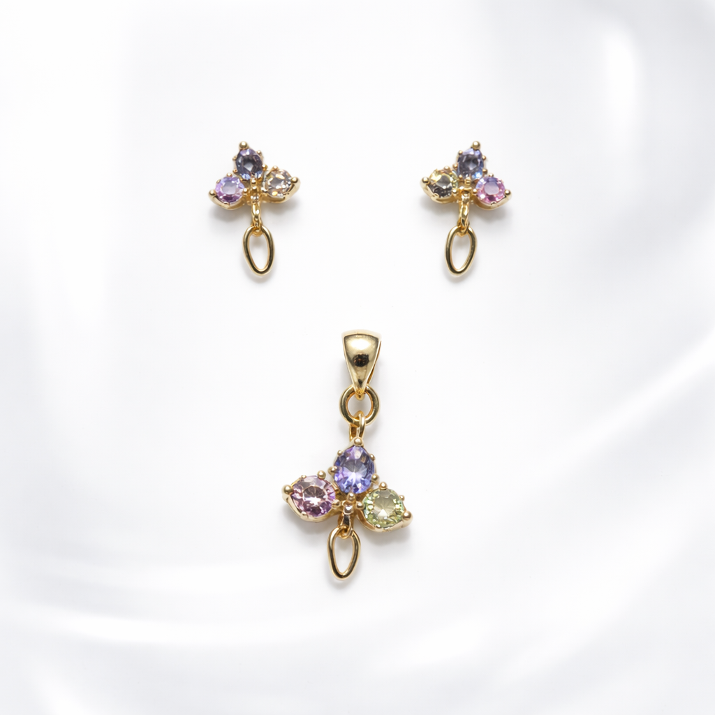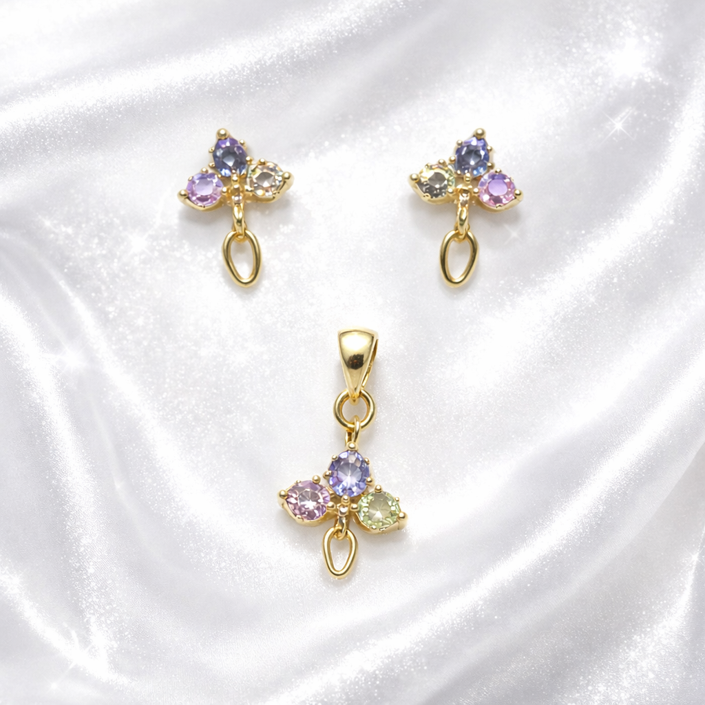 Add timeless elegance to your jewelry collection with this beautifully crafted 10K gold plated jewelry set, featuring a delicate floral design adorned with multi-color crystal stones. The refined shine and elegant detailing make this set perfect for everyday wear as well as special occasions.